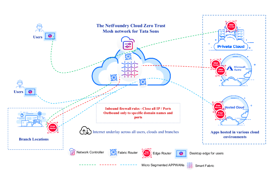 The Tata Sons IT security architecture now exceeds the NIST framework on zero trust architectures for the network layer. NetFoundry Cloud authorizes each end-to-end encrypted session for least privileged access – creating microsegmented networks for each user group that prevents lateral movement of attacks between AppNets (microsegmented networks). Unlike the former complexities associated with the use of VPNs that exposed the vulnerabilities of the public internet, NetFoundry’s solution closes all inbound ports at the customer edge. The apps and endpoints are dark to the internet. This approach by itself keeps most internet originated attacks at bay.