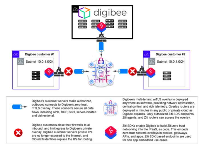 The iPaaS platform now exceeds US Federal government zero trust mandates with mutual TLS, X.509 identities, and a private DNS. CloudZiti authorizes each end-to-end encrypted session for least privileged access – creating micro-segmented networks for each individual customer session. Unlike the former complexities associated with the use of VPNs that exposed the vulnerabilities of the public facing edge, NetFoundry Cloud allowed Digibee to take edges off the internet and available only to authorized endpoints without VPN clients or overlapping, whitelisted static IP addresses – and do it with code and control it all from the cloud.