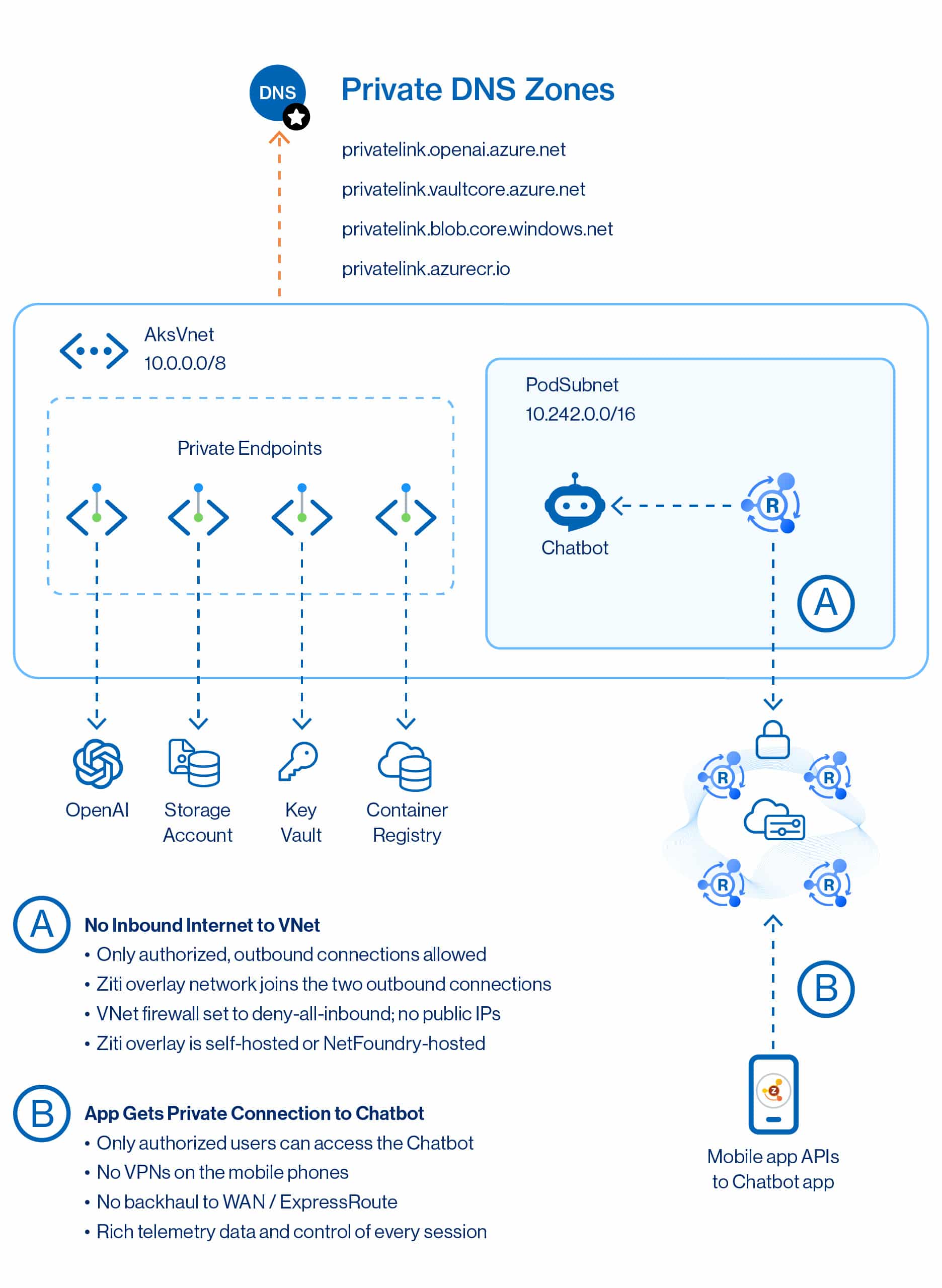 - Adding VPN clients to all the mobile phones (most of which are not controlled by our customers) was not viable. The mobile app leverages multiple environments – only some of the APIs need to go to the Azure chatbot – making VPN backhaul even more unattractive.