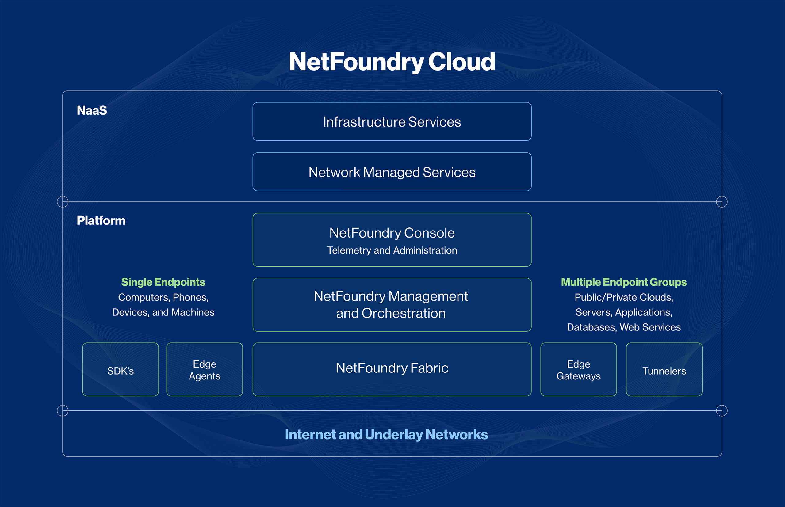 Each overlay is private and dedicated. Infrastructure is managed by NetFoundry as NaaS, or use NetFoundry’s zero trust platform to self-host your overlay, including at air-gapped sites. Extend overlays via: